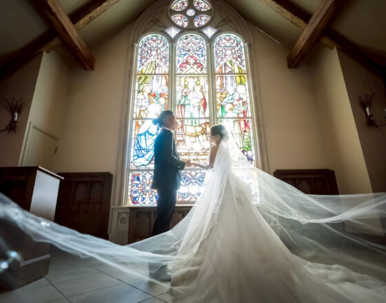 《ステンドグラス輝く大聖堂での模擬体験》扉を開けると140年以上前に創られた本物のステンドグラスに見惚れ、温かみのある空間が広がる。幻想的で厳粛なチャペル空間を体感してみて。