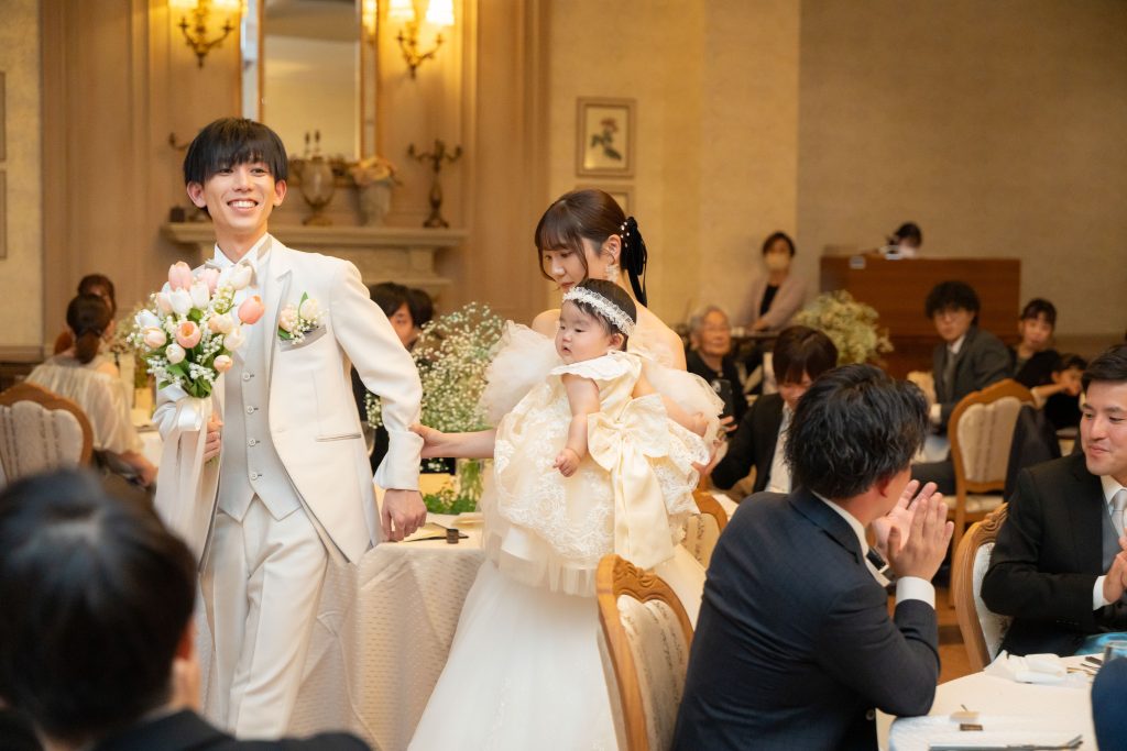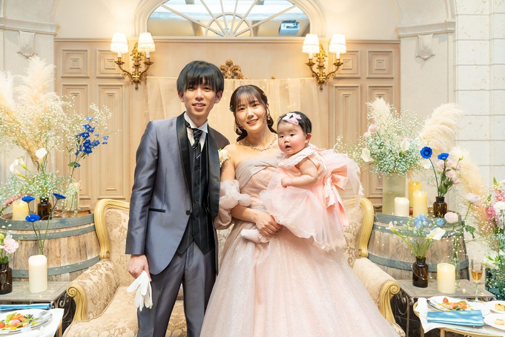 お色直しではお子さまと同じカラーのドレスで登場。家族のつながりを感じられるコーディネートに。