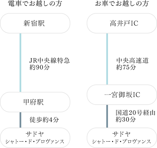 新宿駅から最寄りの甲府駅まで中央線特急でおよそ90分。八ヶ岳・蓼科といったエリアより30分以上も近く、よりアクセスしやすい立地です。さらに駅からも徒歩5分という至便な環境なので、日帰りのゲストにも、ゆっくりと時間いっぱいまで安心してお過ごしいただけます。