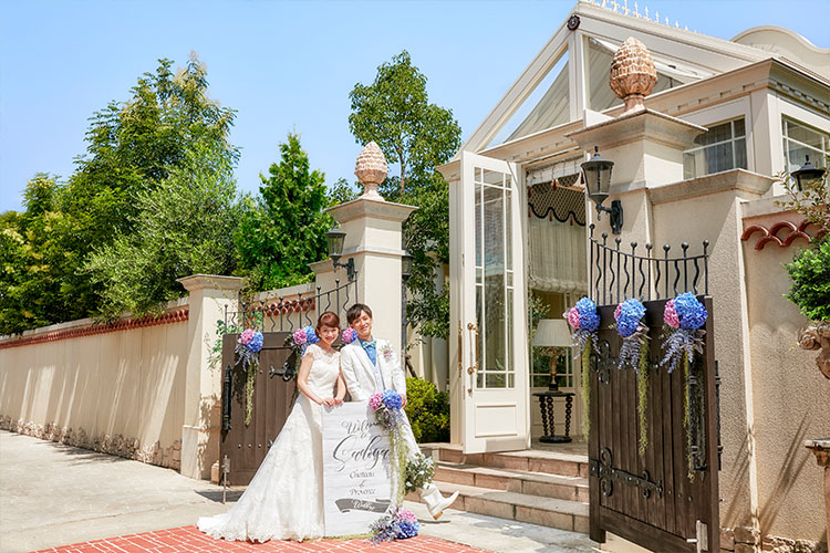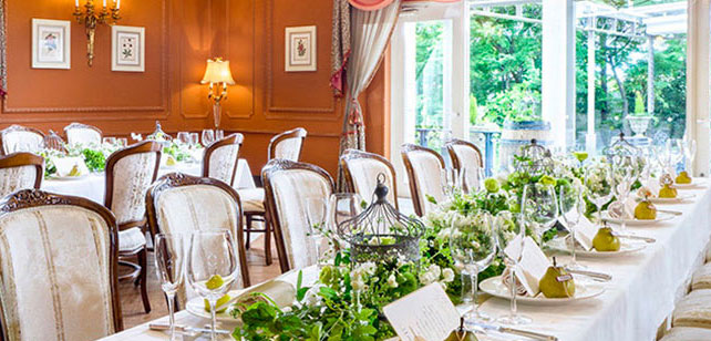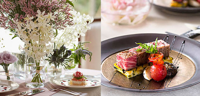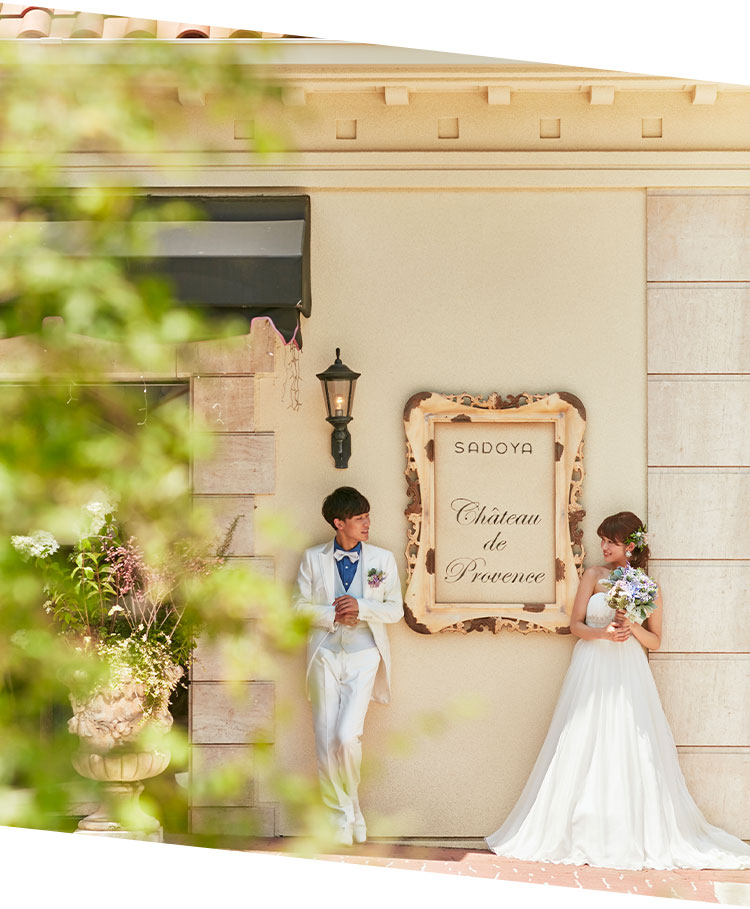 挙式のあとは敷地内のレストランで、ご会食もお楽しみいただけます。多彩な味わいのフレンチをベースに和のテイストを盛り込んだ創作コース。味わいはもちろん、ウエディングらしく見た目にも拘った美しい一皿をお届けします。ソムリエが厳選したSADOYAのワインとともに至福のひとときをお過ごしください。