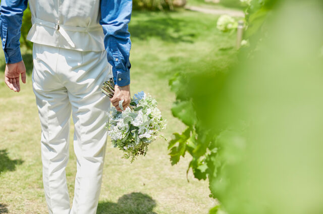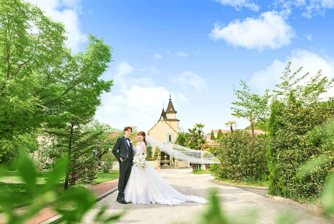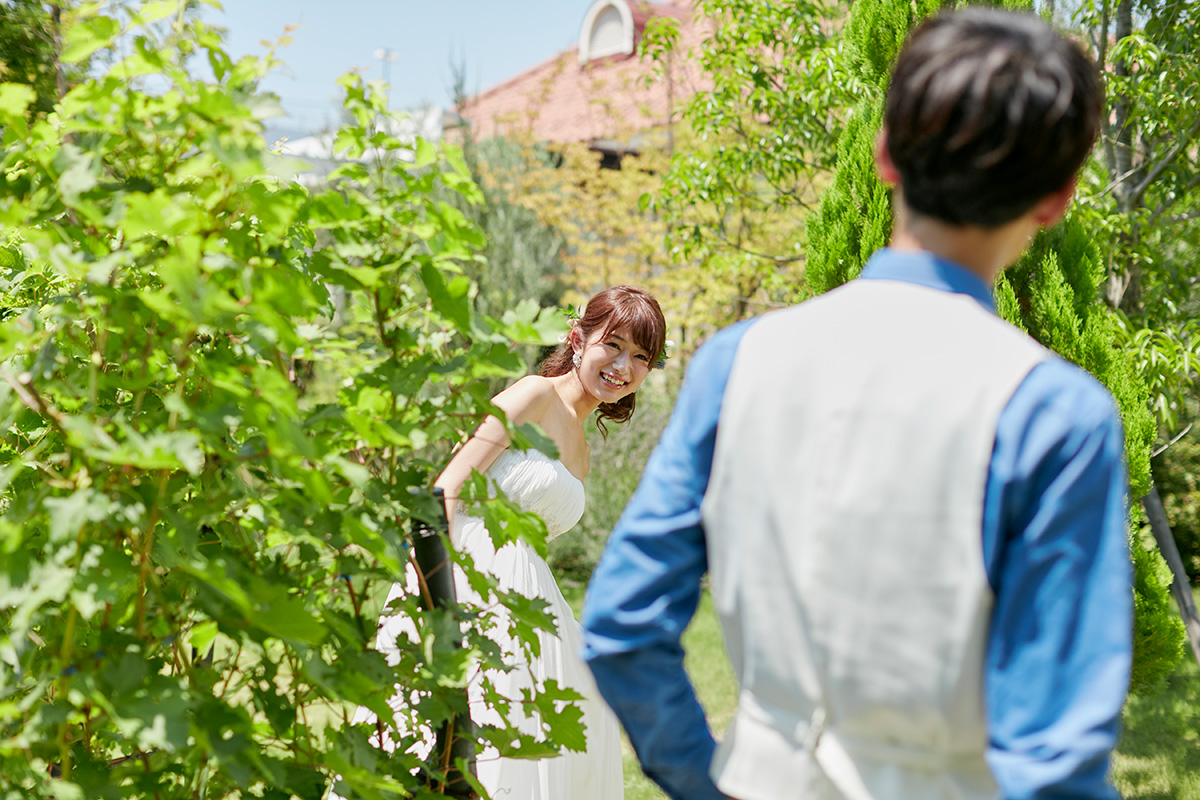 挙式前に、ワイナリーらしい葡萄棚や噴水、ワインの貯蔵樽が配される緑豊かなガーデンで、記念撮影タイム。