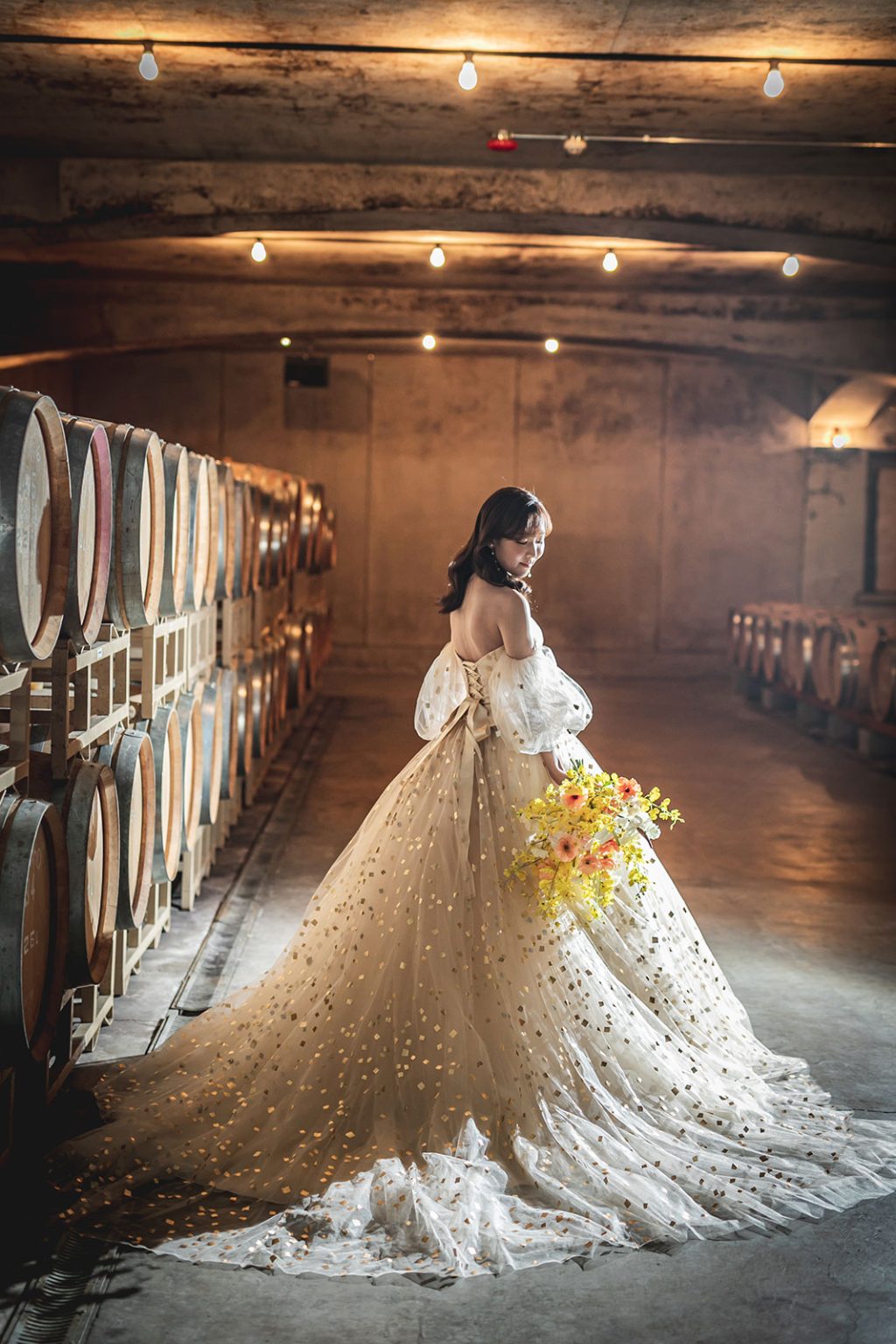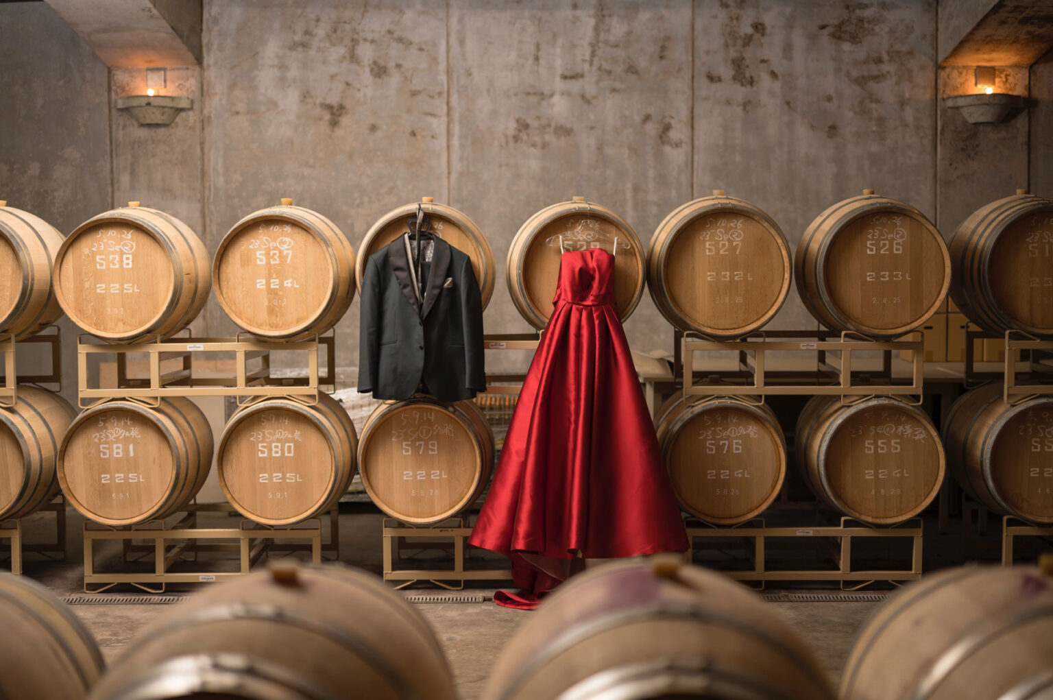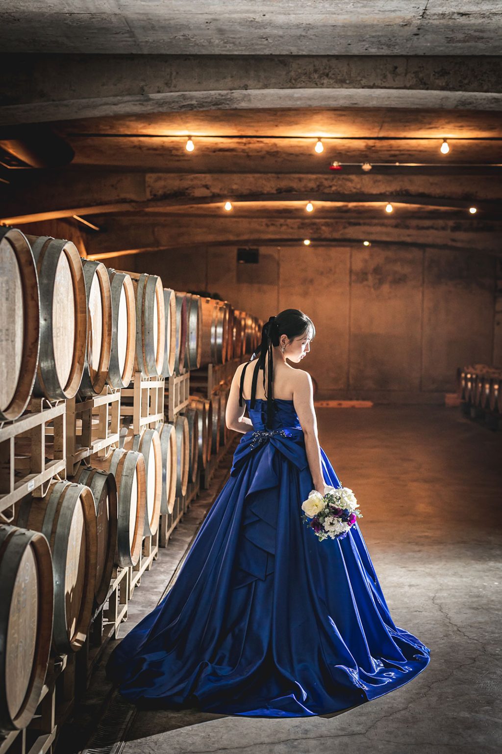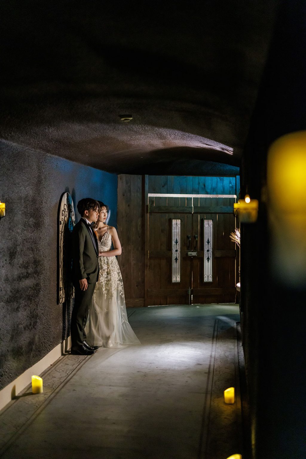 スタッフがおふたりのゲストを地下セラーにご案内。地下に近づくにつれ徐々に暗くなり、ヒンヤリとした空気とワインの香りが漂う。これからはじまる祝宴への期待も膨らみます。