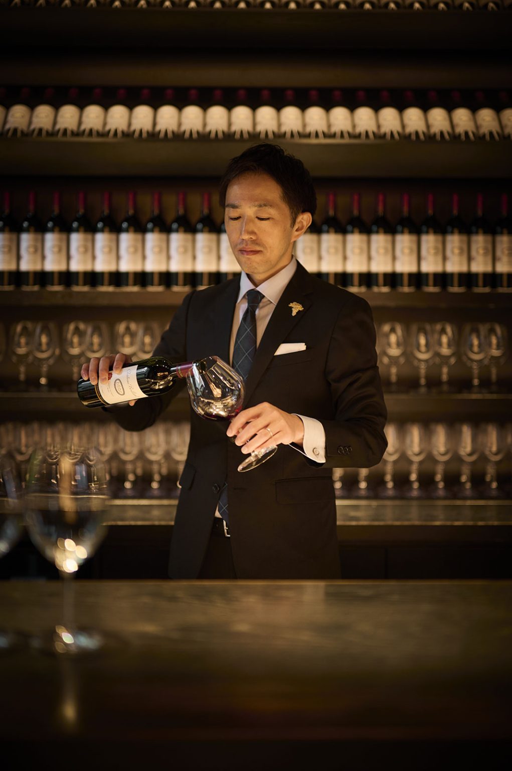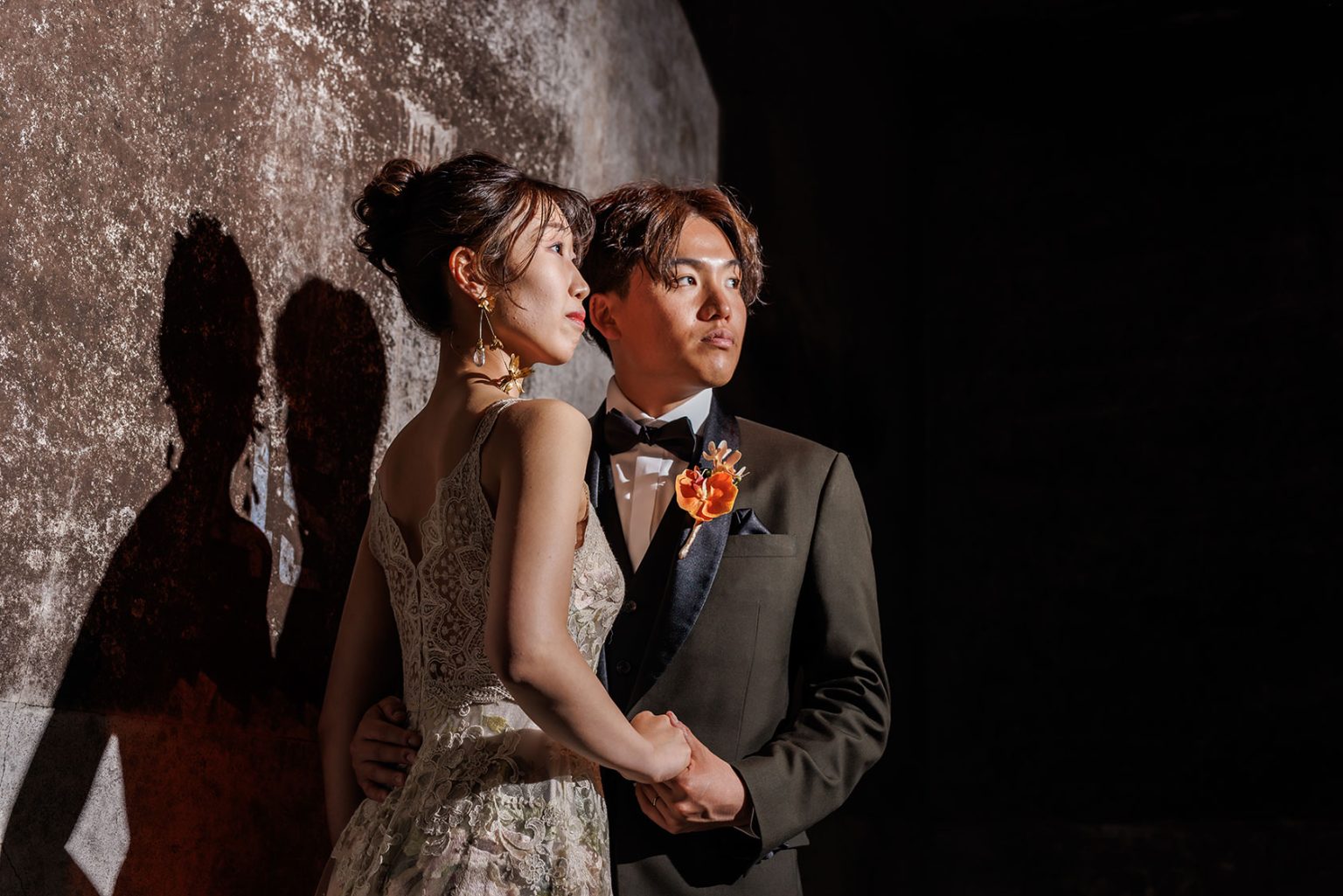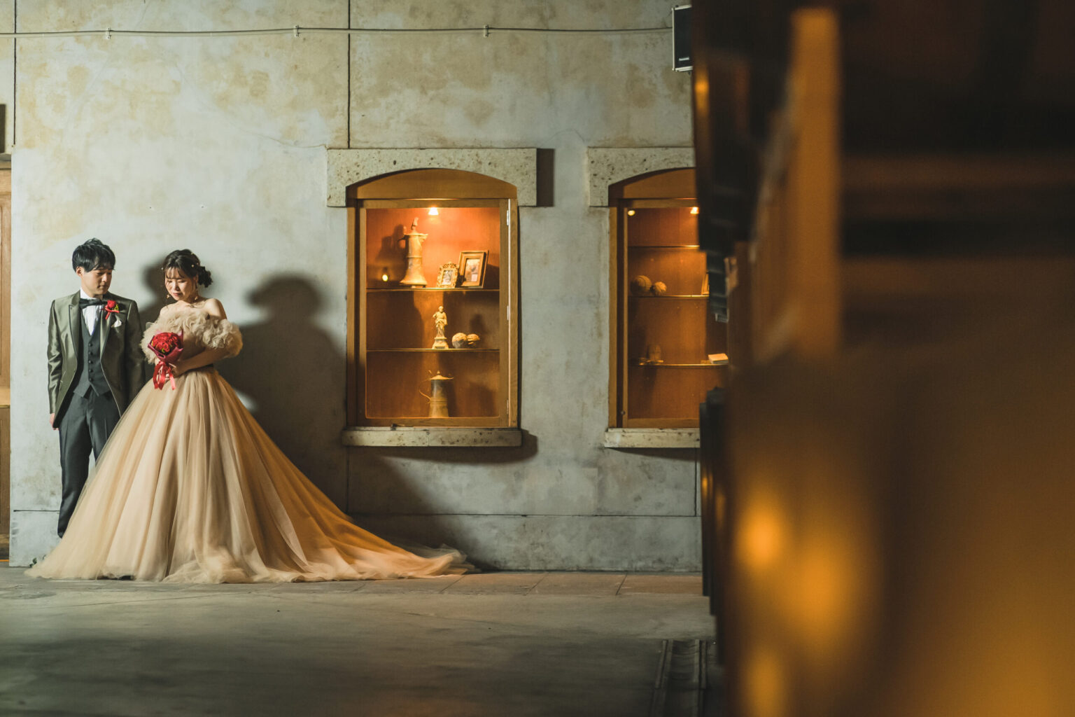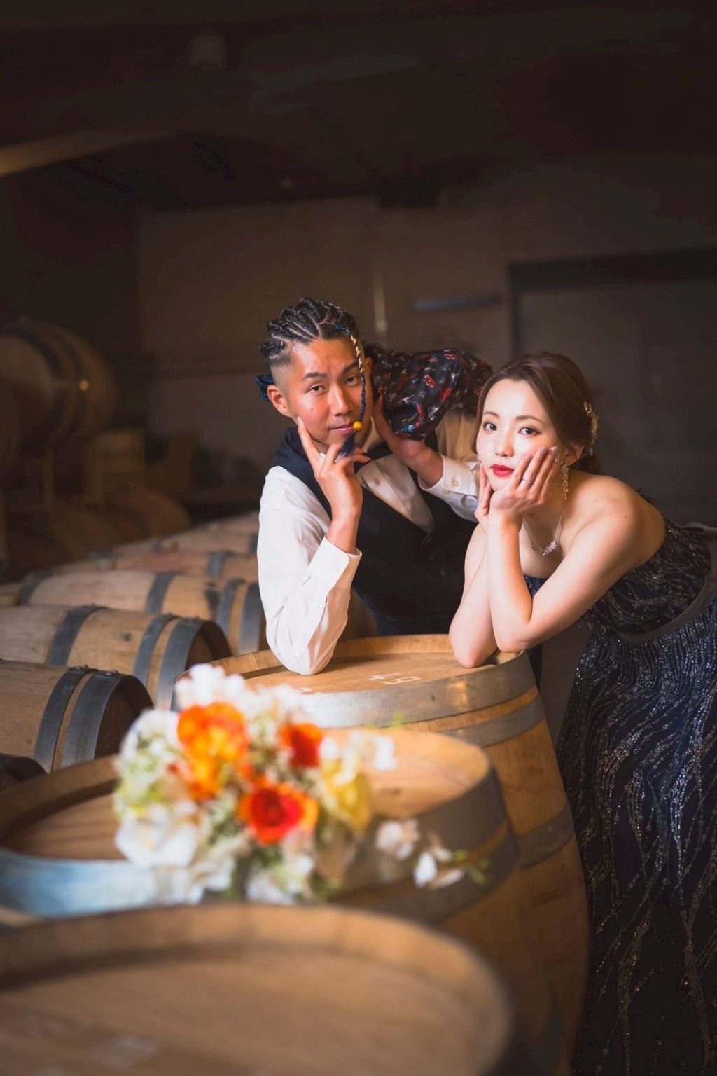 スタッフがおふたりのゲストを地下セラーにご案内。地下に近づくにつれ徐々に暗くなり、ヒンヤリとした空気とワインの香りが漂う。これからはじまる祝宴への期待も膨らみます。