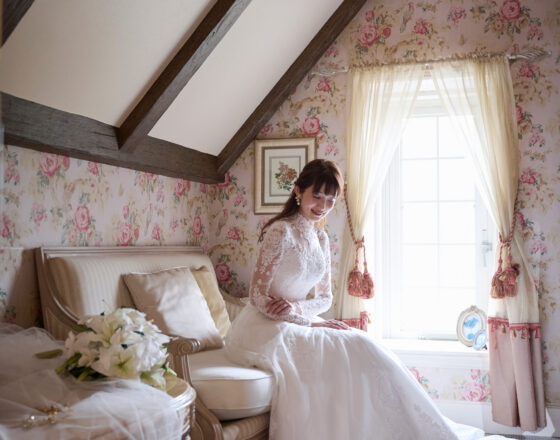 落ち着いた調度品の揃ったブライズルーム。 この日のために選んだドレスを纏い、これから始まる一日へ想いを巡らす特別な時間となります。